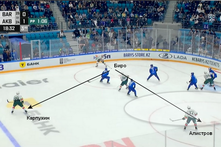 Другой момент: с шайбой Биро, у которого два варианта. Сложный — диагональ на Владимира Алистрова и простой — пас защитнику Илье Карпухину. Канадец снова выбирает то, что попроще, — атака ничем не завершается.