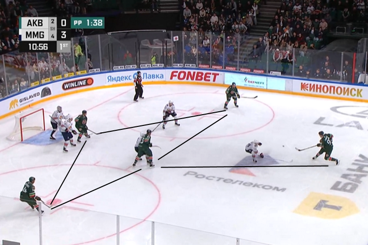 Начнем с простого: «Ак Барс» во всех матчах сезона играет в большинстве по схеме «зонтик». Называется она так по расположению игроков: если расчертить линии между хоккеистами, то выйдет зонтик. Это наиболее популярная схема в КХЛ, по которой играет бóльшая часть команд. Что касается «конверта», еще одной популярной схемы, то «Ак Барс» в него в этом сезоне не играл.
