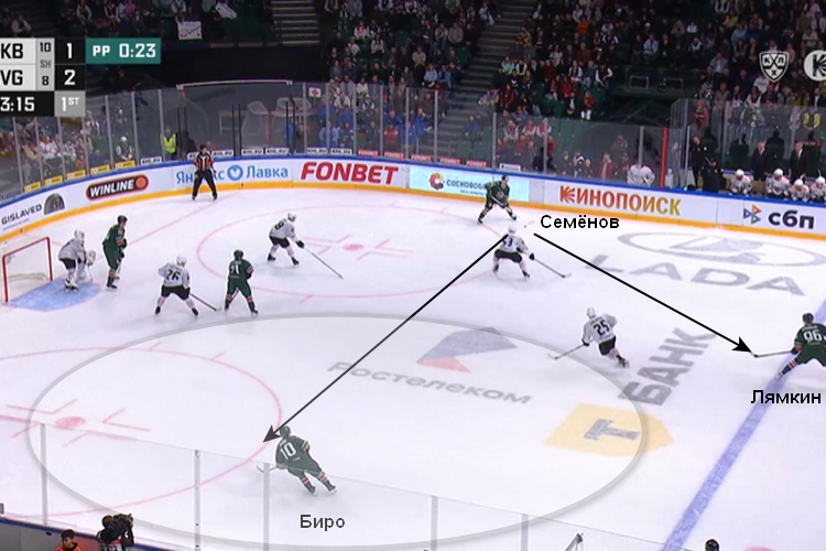 Вот еще два таких же моментов. На льду вторая спецбригада, с шайбой форвард Кирилл Семенов. У игрока есть вариант отдать диагональ на Биро, который стоит в одиночестве, либо скинуть на защитника Никиту Лямкина. Семенов не стал рисковать, ограничился короткой передачей на ближнего — атака ничем не закончилась.