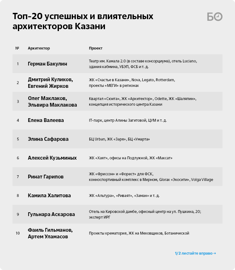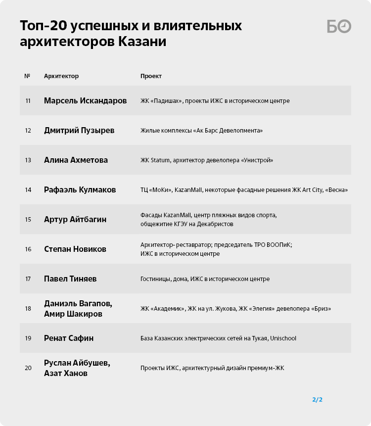 Ежегодно в первый понедельник октября отмечается Всемирный день архитектуры. В канун праздника «БИЗНЕС Online» решил взглянуть на творчество выходцев из Казани — тех, кто проектирует прямо сейчас, предложив свою версию рейтинга успешных и влиятельных архитекторов из столицы Татарстана. Критериями оценки послужили наличие реализованных или потенциально знаковых проектов (в том числе в историческом центре), известность в профессиональном сообществе, медийность, наличие собственного бюро. Методика включала серию глубинных интервью с участниками архитектурного процесса, в том числе и девелоперов, — на основе их оценок экспертный совет расставил названные имена по ранжиру.