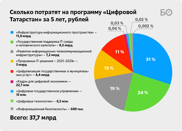 Интересна и структура бюджета. Она наглядно отображает утвержденные приоритеты отрасли на ближайшие пять лет. Почти треть средств — 11,8 млрд рублей — потребуется на развитие информационного пространства — по факту на поддержку традиционных (читай: гос.) медиа: печати, издательской деятельности и телерадиовещания (на ТВ, к слову, за пять лет потратят 7,4 млрд рублей). Еще четверть — 9,3 млрд рублей — государственная поддержка IT-среды и человеческого капитала. Сюда зашито финансирование IT-парка, бизнес-инкубатора, МФЦ и самого министерства, т. е. инфраструктурные расходы, без которых система не работает, но которые сами по себе не создают прямой эффект для граждан и бизнеса.