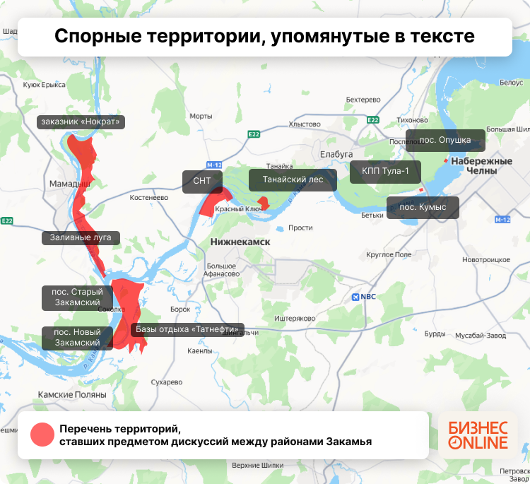 Официальный комментарий «БИЗНЕС Online» в администрации Мамадышского района дать отказались, но, по нашим данным, ответ по инициативам глав Нижнекамска и Елабуги будет отрицательным. Во-первых, район намерен отстаивать свои исторические границы, Никитин хочет осваивать береговую зону Камы. Кроме того, отдельный интерес может касаться хорошего налогоплательщика — «Татнефти», у которой южнее поселков Новый Закамский и Старый Закамский расположены базы отдыха. Точный размер этой территории, за которую выступает Нижнекамск, неизвестен — может достигать также нескольких тысяч гектаров.