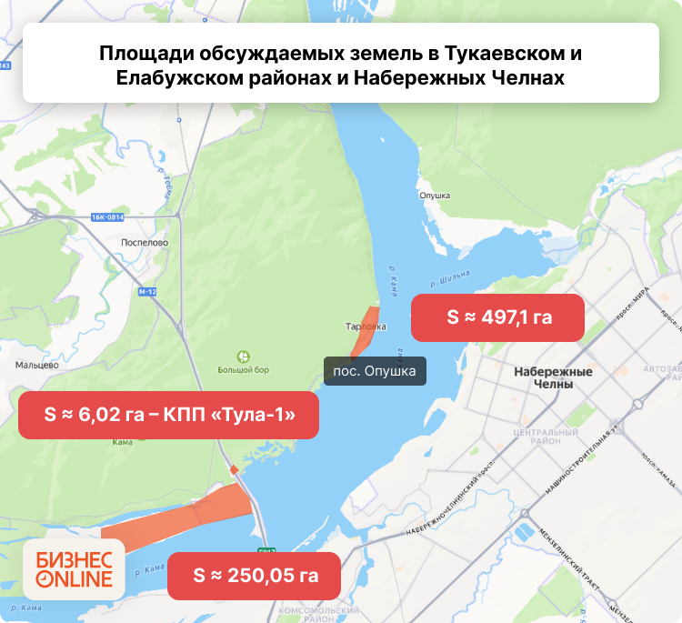 - часть территории Елабужского района в границы Набережных Челнов — КПП «Тула-1» (примерная площадь — 6,02 га);