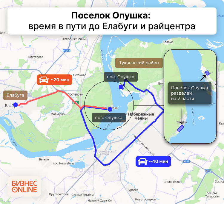 Та часть Опушки, которая «вклинивается» в Елабужский район, по наблюдениям корреспондента «БИЗНЕС Online», представляет собой поселок с обзорным видом на Каму, но без удобств. Например, там нет асфальтированных дорог — они заканчиваются в Тарловке. Логично, ведь Опушка — это тукаевский поселок, тратить на него деньги Елабуги нельзя, а с другого берега сюда дорожная техника не доедет.