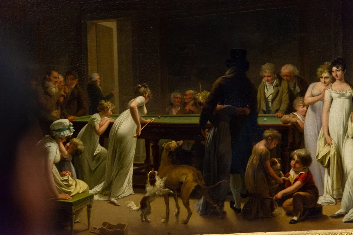 Данная картина прославилась и вызвала скандал на выставке в Париже в начале XIX века. В то время бильярд был сугубо мужским временем препровождения, объясняет Виленская, поэтому в картине Луи Леопольда Буальи увидели эротический подтекст. А именно в главной героине, которая склонилась, чтобы сделать удар кием (она играет в карамболь). Кстати, Буальи на картине нарисовал и себя. Это круглолицый мужчина в коричневом фраке в левом верхнем углу. Это произведение можно увидеть во втором зале.