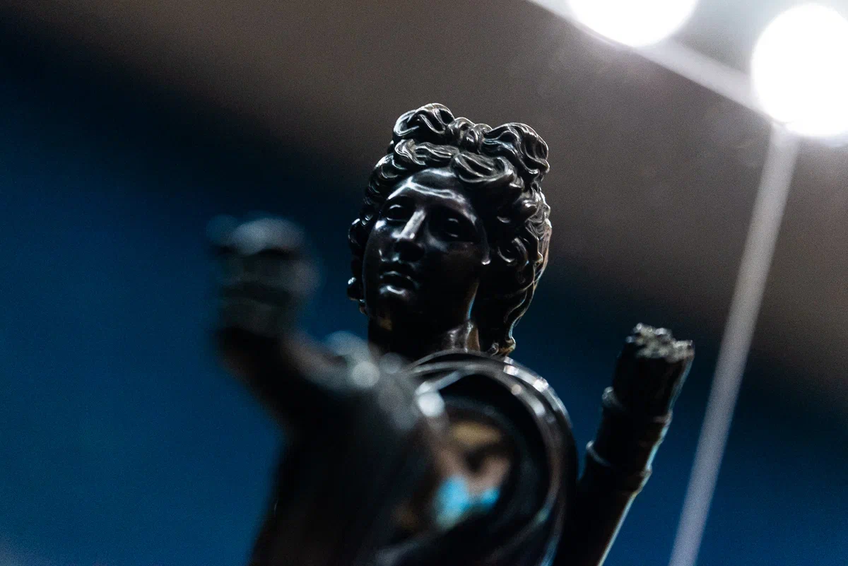 Небольшие черные скульптуры дополняют выставку. На фотографии «Аполлон Бельведерский» французского мастера второй половины XVIII века.