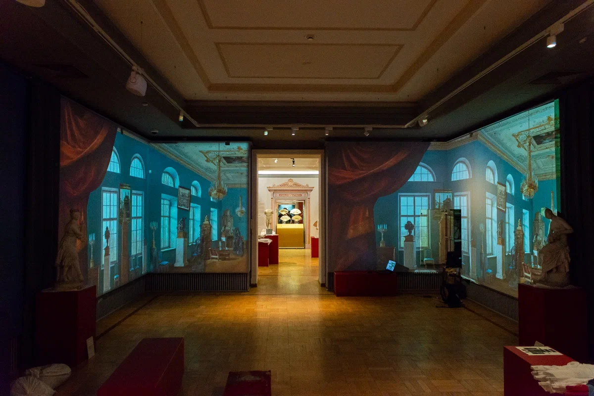 Зал с интерактивной частью. С помощью проектора показаны убранства дворца Юсуповых на Мойке в Петербурге и усадьбы «Архангельское» в Москве. А скульптуры Луиджи Бьенеме возле стен «проводят» гостей на выставку.