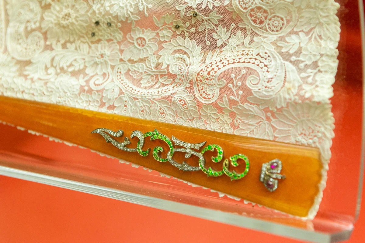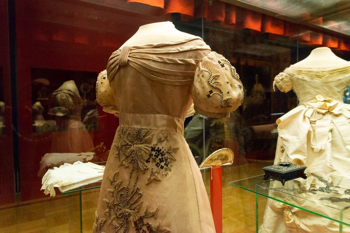 На фото бальное платье, расшитое бусами, принадлежавшее Зинаиде Ивановне Юсуповой, на заднем фоне наряд Татьяны Александровны Юсуповой, жены и двоюродной сестры Николая Борисовича – младшего. Они так хотели быть вместе, что даже императору Александру II пришлось закрыть глаза на их родство.