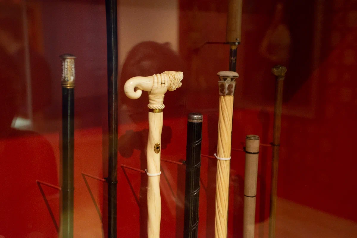 Коллекция тростей. Самые необычные, светлых тонов, сделаны из рога нарвала — «морского единорога», редчайшего млекопитающего, который обитает в Северном Ледовитом океане.