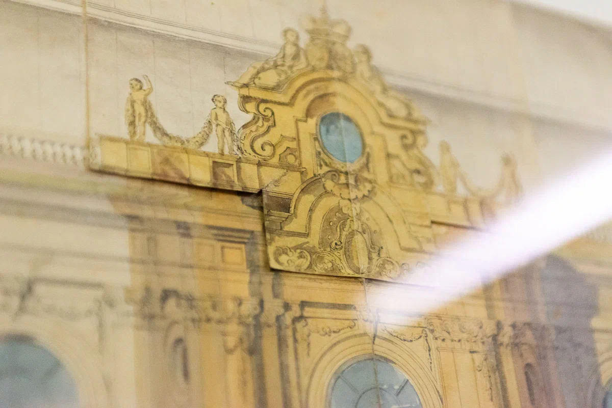 Эскиз дворца на Литейном проспекте в Санкт-Петербурге, принадлежавший княгине Зинаиде Ивановне Юсуповой. Поскольку тогда компьютеров не было, проект дизайна показывали так: на эскиз в некоторых частях накладывали еще слои бумаги, на которых нарисованы дополнительные варианты того, какими узорами, чем можно украсить дворец. Например, построить две кариатиды или три, балкон с двумя вазами или тремя и т. д.