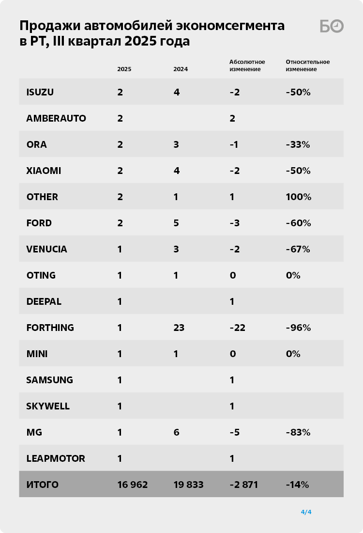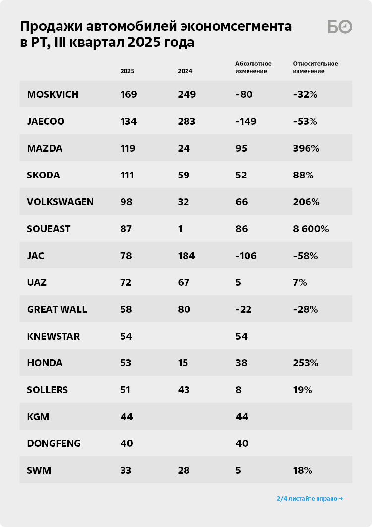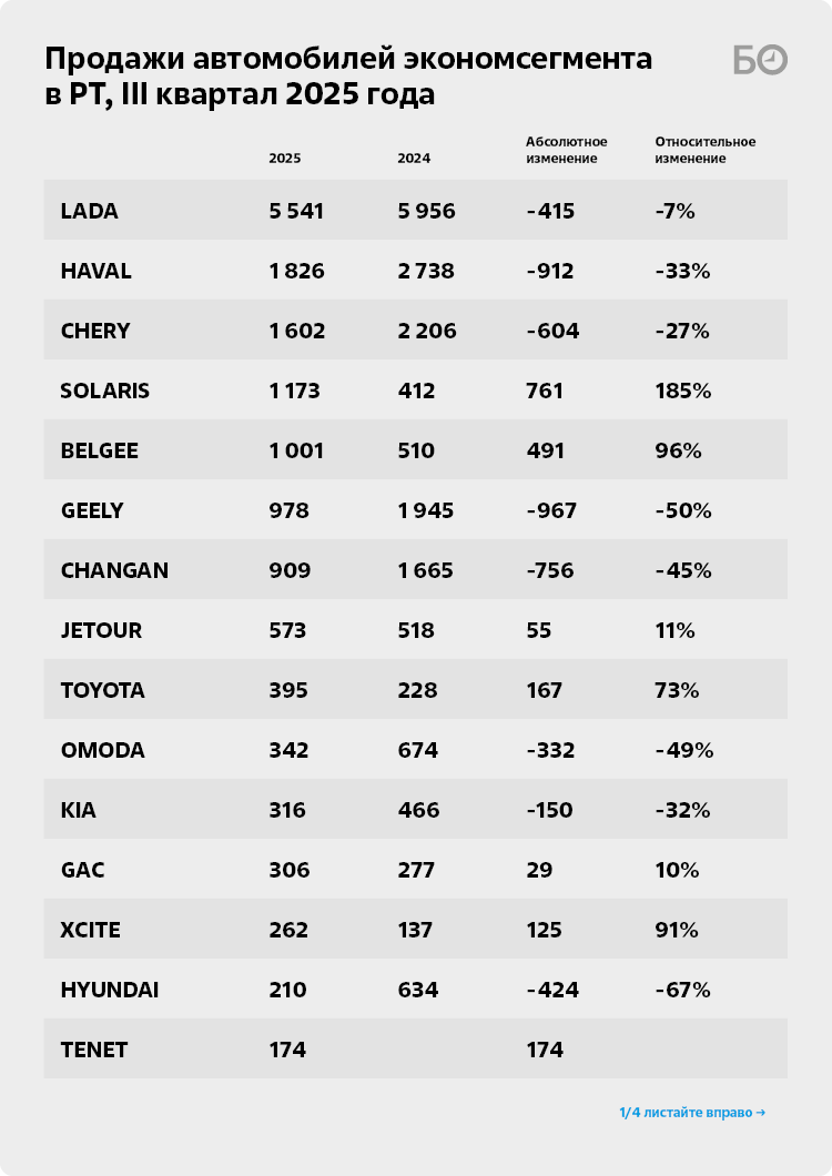 На фоне общероссийского спада продаж новых автомобилей на 22% АвтоВАЗ, обласканный государственными мерами поддержки, переживает очередной кризис. Завод перешел на четырехдневку, а его доля на рынке сократилась вдвое. При этом в Татарстане, где рынок только за III квартал 2025 года просел на 15%, набирают силу китайские бренды, а белорусская сборка Geely и вовсе обогнала по продажам «оригинального» китайского производителя. Подробнее о состоянии автомобильного массмаркета в стране — в материале «БИЗНЕС Online».