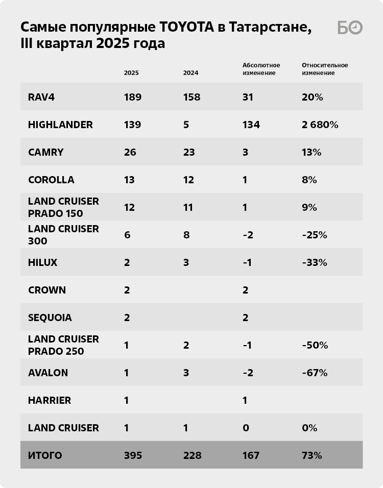 Любимец публики — среднеразмерный кроссовер Rav4 — прибавил 20%, что в итоге вылилось в 189 регистраций. Второй самой популярной моделью ушедшего бренда стала Toyota Highlander, продажи которой выросли в 27 раз — с 5 до 139 авто. Спрос на бизнес-седан Camry остался практически на уровне прошлого года — 26 зарегистрированных новеньких ТС. Помимо «классических» моделей, в Татарстане встали на учет две Sequoia — рамный внедорожник с V-образным 6-цилиндровым мотором объемом 3,5 литра. Разница у них только одна: у одной модели мощность мотора составляет 394 л. с., у другой — 436 л. с. Обе машины оформлены на компании.