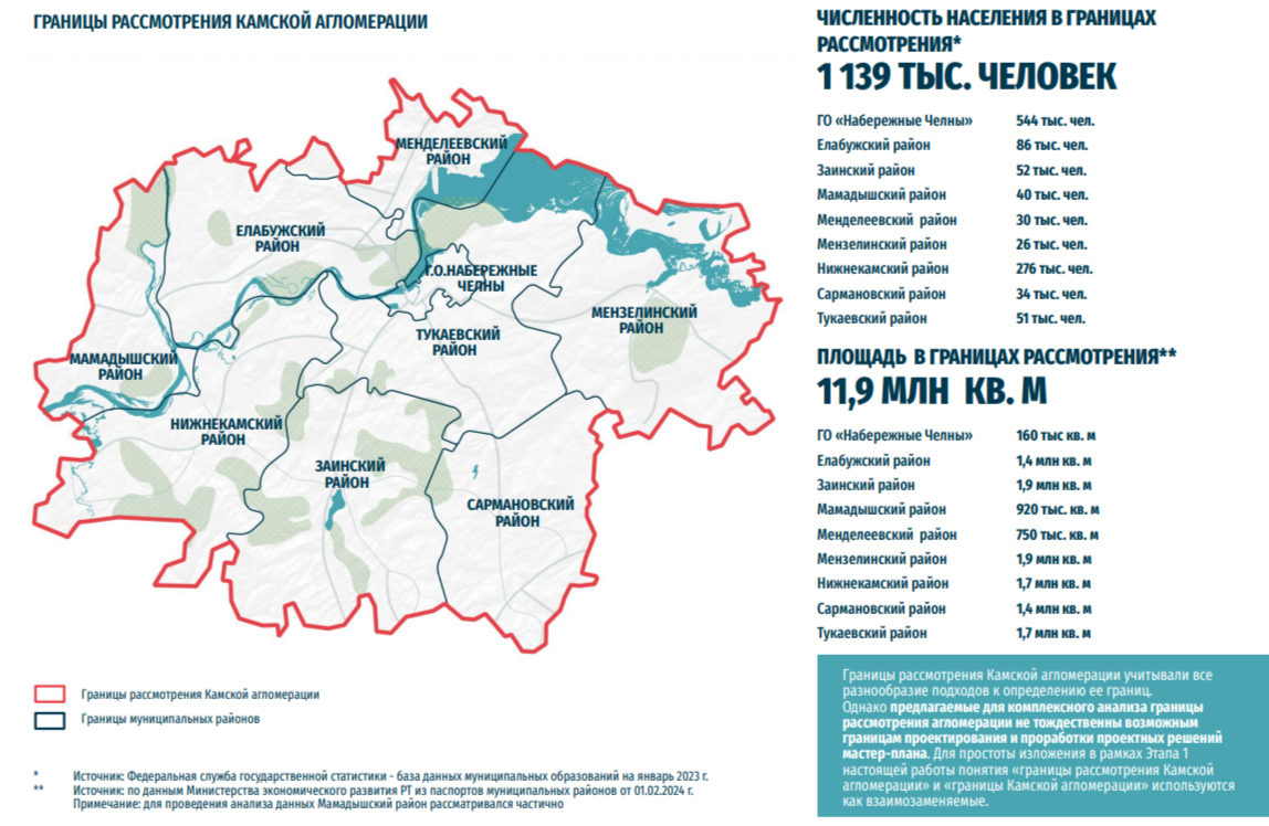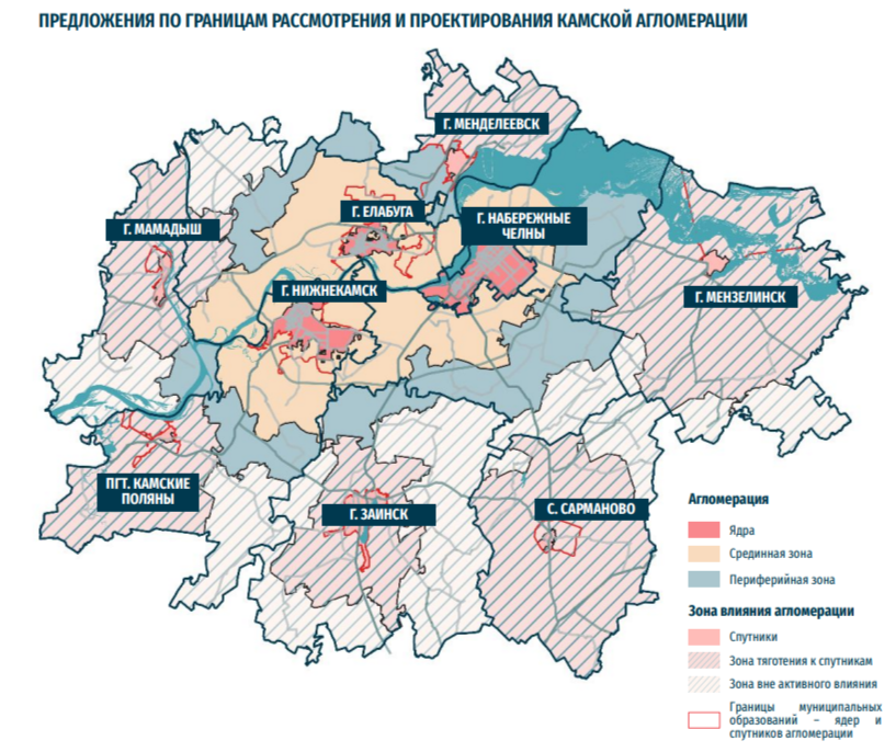 Например, в минэкономразвития РФ называют территорию Набережночелнинской агломерацией, в которую, помимо автограда, входит только Тукаевский район. Иная трактовка с пятью муниципалитетами в Стратегии социально-экономического развития Татарстана — такая же в проекте комплексного развития Камской агломерации «Иннокам». В Камской экономической зоне, согласно Стратегии социально-экономического развития РТ, сразу 9 районов, которые ИПП предлагает скорректировать, заменив Агрызский и Актанышский районы на Заинский и Сармановский.