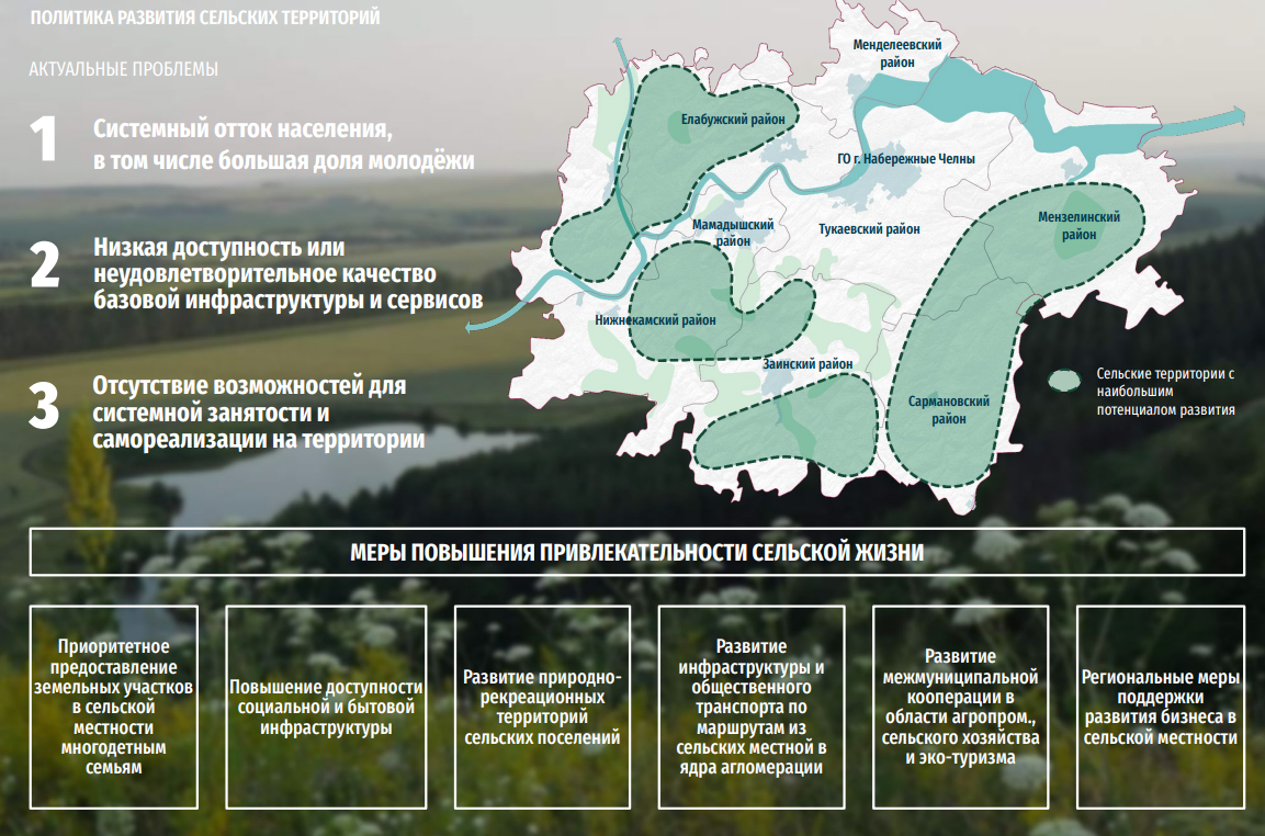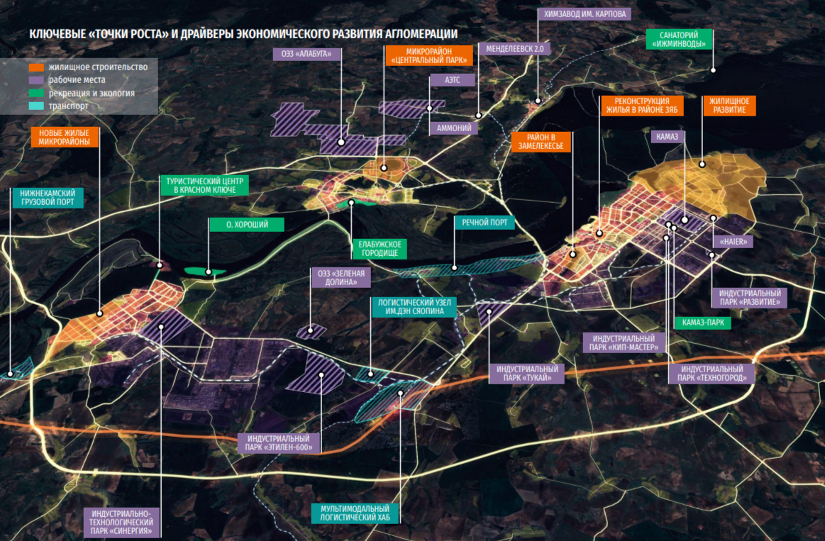 - Агломерационный. Набережные Челны — вторая столица РТ и центр российской автоиндустрии, потенциальный конкурент Казани. Нижнекамск — неоиндустриальный город. Елабуга — культурный центр агломерации, синергия истории и технологии.