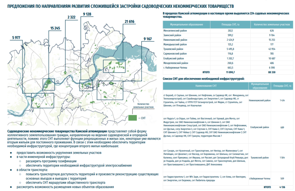 Выделяется в этом списке идея ИПП поддержать развитие СНТ. Суммарно в Камской агломерации насчитали 224 товарищества площадью 11 га с 88,3 тыс. участков. Повышенного внимания удостоятся СНТ, расположенные на площади 4 тыс. га в Нижнекамском, Елабужском, Тукаевском районах и Набережных Челнах. Там предлагают: