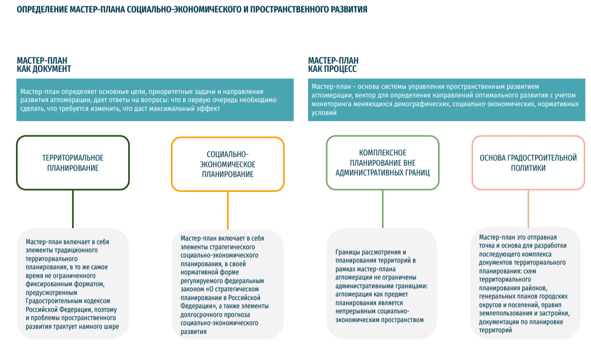 Помимо территориальных, мастер-план агломерации также включает элементы стратегического социально-экономического планирования, служит основой для схем территориального планирования районов, генеральных планов городов и поселений, правил землепользования и застройки, проектов планировок территорий.