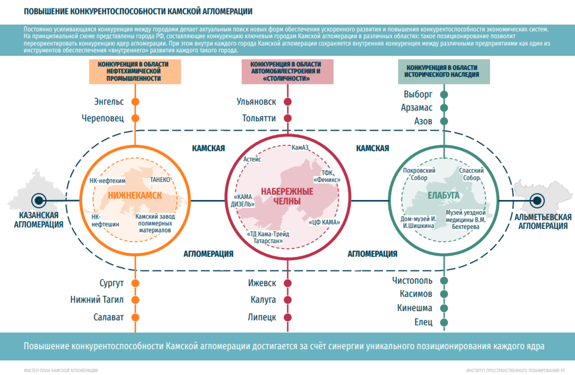 Повышать конкурентоспособность Камской агломерации предлагают за счет синергии каждого из трех ядер. Приглядимся к тому, как хотят развивать и позиционировать Камскую агломерацию на трех уровнях: