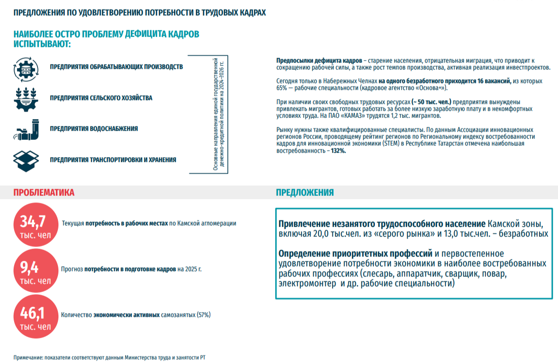 Свободные трудовые ресурсы в Закамье есть и, по оценке разработчиков мастер-плана, доходят до 33 тыс. человек — это безработные и работники серого рынка. Текущая потребность в кадрах — 34,7 тыс. человек. На этом фоне предприятия вынуждены привлекать мигрантов, готовых работать за более низкую заработную плату и в некомфортных условиях труда. По состоянию на 1 июля 2024 года только в Набережных Челнах насчитывалось 3,7 тыс. трудовых мигрантов, из которых 2,7 тыс. работают на КАМАЗе.