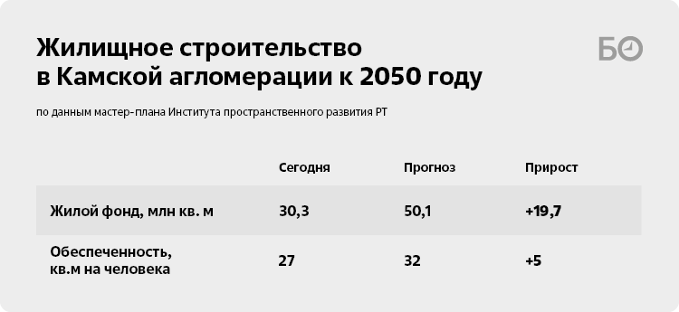 Массовое строительство жилья ИПП концентрирует в Елабужском районе. Там к 2050 году видят стройку 5,3 млн кв. м жилья, на 2-м месте Челны, где возведут 4,5 млн кв. м, замыкает тройку Нижнекамский район, где видят еще 4,6 млн кв. м жилья. На 4-й строчке Тукаевский район с потенциалом строительства 3,4 млн кв. м жилья. Замыкает пятерку Менделеевский район — 450 тыс. кв. м нового жилья к 2050-му. В итоге площадь жилого фонда вырастет на 65% с 30,3 млн до 50,1 млн кв. м, жилищная обеспеченность увеличится на 5 «квадратов» до 32 кв. метров.