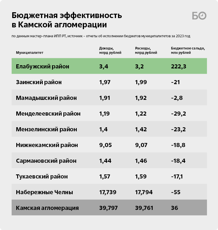 Наличие проблем подтверждает и показатель бюджетной эффективности агломерации за 2023 год. Только у Елабужского района положительный результат — профицит бюджета составил 222,3 млн рублей. В остальных — дефицит: Набережные Челны в минусе на 55 млн рублей, в Нижнекамском районе дефицит — 18,8 млн рублей, в Менделеевском районе — 29 млн рублей. И лишь благодаря Елабуге общий показатель Камской агломерации находится в плюсе.