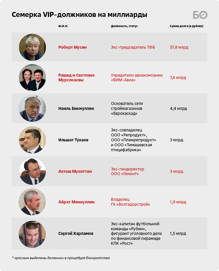 Среди должников найдены и бывшие соратники экс-банкира Мусина. В РТК бывшего первого зама председателя правления ТФБ Рамиля Насырова (с 2021 года по сей день он проходит процедуру банкротства) всего два кредитора: Московский кредитный банк и Альфа-Банк с требованиями по 1,3 млн рублей каждый. По словам самого Насырова, проданного в рамках банкротного дела имущества хватит, чтобы расплатиться по этим долгам. Однако уже по окончании банкротства ТФБ на всех топ-менеджеров банка (в том числе и на Насырова) будет начислена субсидиарная ответственность, новая сумма долга, вероятнее всего, станет неподъемной.