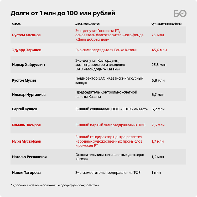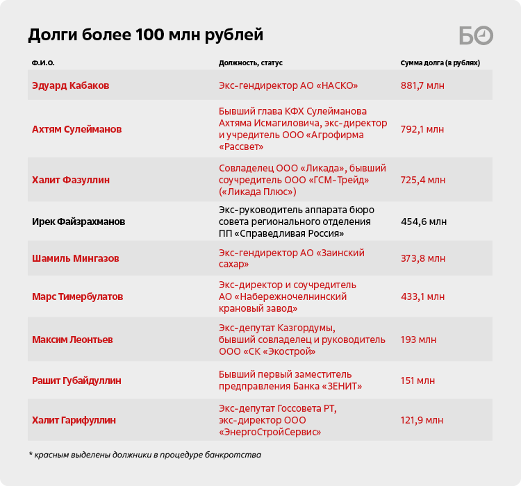 «БИЗНЕС Online» публикует очередной рейтинг публичных личностей Татарстана, которые имели неосторожность накопить долги. Всего через официальный сайт федеральной службы судебных приставов (ФССП) России корреспондентом было проверено более 1,7 тыс. персон — крупных бизнесменов, депутатов, госслужащих, деятелей культуры, спортсменов. У некоторых из них нашлись небольшие задолженности по кредитам, кто-то по забывчивости не оплатил услуги ЖКХ, а самые «шустрые» задолжали миллиарды и теперь носят «гордое» звание банкротов. Чтобы оценить положение последних, дополнительно была изучена картотека арбитражных дел, а также сервисы Casebook и «Контур.Фокус».