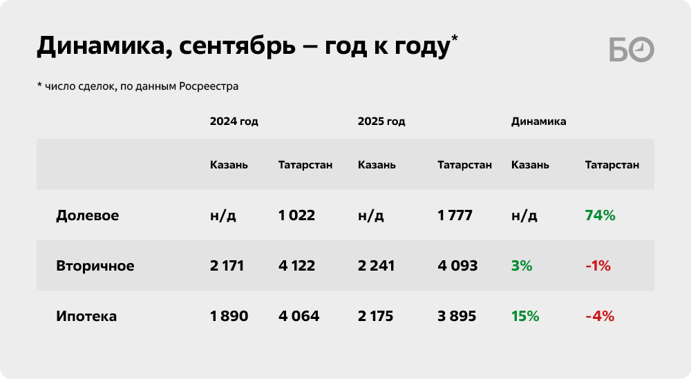 Весьма оптимистично выглядят сентябрьские данные управления Росреестра по РТ в части новостроек. Зарегистрировано 1 777 сделок — на 74% больше, чем в сентябре 2024-го.