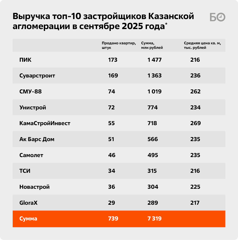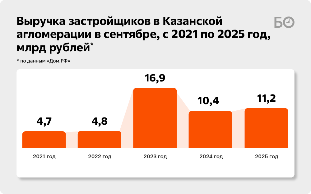Выручка застройщиков в Казанской агломерации в сентябре составила 11,2 млрд рублей — это следует из отчетности «Дом.РФ». Конечно, не сравнится с «жирным» 2023 годом, где стрелка на графике резко взлетела вверх, аж до 17 млрд, но о приближающихся массовых банкротствах говорить тоже не приходится. Ну а первая десятка девелоперов реализовала за сентябрь 739 квартир на сумму 7,3 млрд рублей.