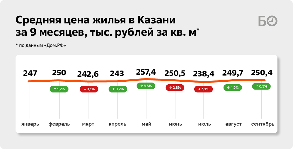 В Казани средняя цена новостройки в сентябре зафиксировалась на уровне в 250,4 тыс. рублей за «квадрат». По Татарстану («Дом.РФ» включает сюда и Казань) — 213 тысяч. За 9 месяцев рост составил всего 1,5%. В последние несколько месяцев некоторые эксперты «БИЗНЕС Online» сигнализируют о повышенных скидках со стороны застройщиков.