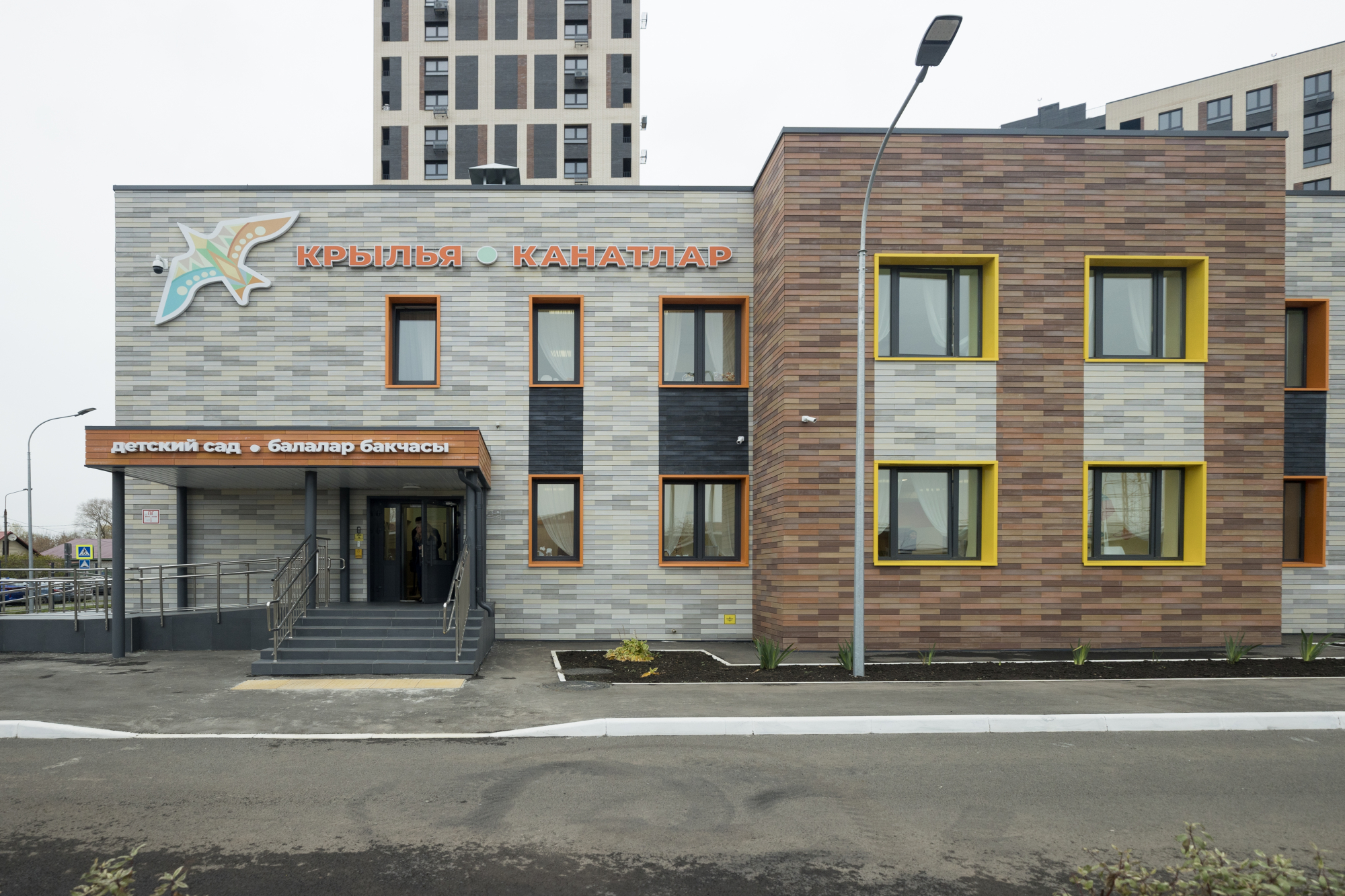 В двухэтажном здании расположились две ясельные группы, две группы для детей постарше, медицинский кабинет, сенсорная комната, музыкальный зал. Кроме того, детский сад оборудован кабинетом робототехники, лабораторией, зонами речевого развития и спорта, а также студией татарского языка.