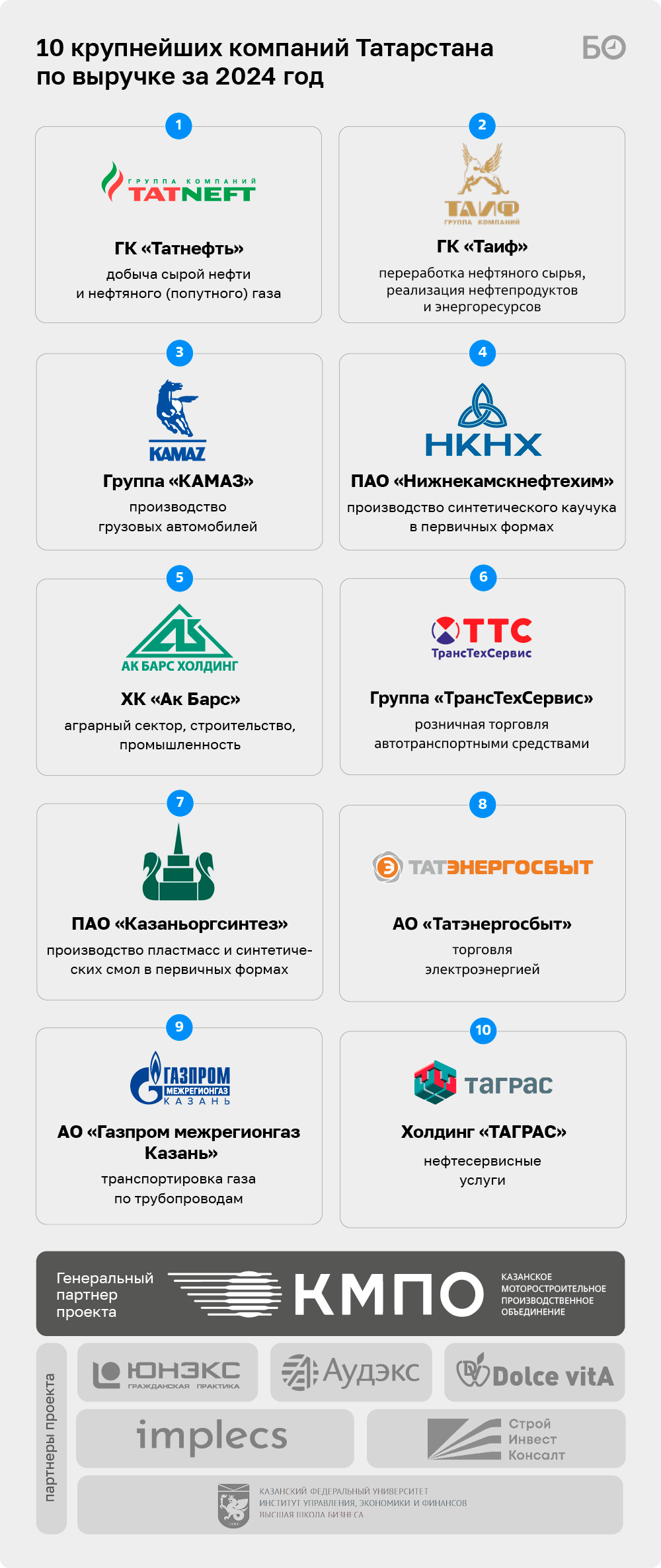 В наш рейтинг включены только юрлица, зарегистрированные на территории РТ. Для составления данного рейтинга мы опираемся на выручку компаний за 2024 год, указанную в сданной в ФНС налоговой отчетности. В случае если несколько компаний объединено в холдинг, то на консолидированную отчетность. Изучить данные по собственникам фирм нам помогает база «Контур.Фокус», где первоисточник для ООО — выписки из ЕГРЮЛ, а по акционерным обществам — данные самих компаний.