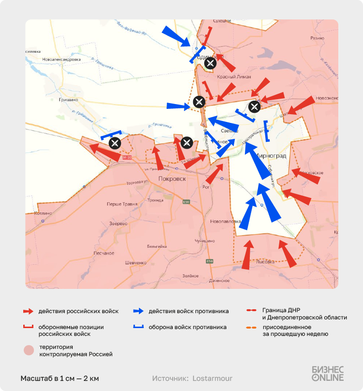 Основной точкой медийного притяжения во всей зоне проведения специальной военной операции остается Красноармейск (Покровск) и Димитров (Мирноград). Наши части практически завершили освобождение Красноармейска, а противник, теряя время и солдат, отступает на северо-восток котла. В свою очередь генерал Александр Сырский пытается пробиться к гарнизону через добропольский выступ, полагая, что, срезав его, он откроет дорогу на выход. Одновременно бывший главком ВСУ генерал Валерий Залужный написал новую статью, в которой заявил, что воевать Киеву нужно и дальше. О том, где российские войска достигли наибольших успехов, — в еженедельном обзоре «БИЗНЕС Online».