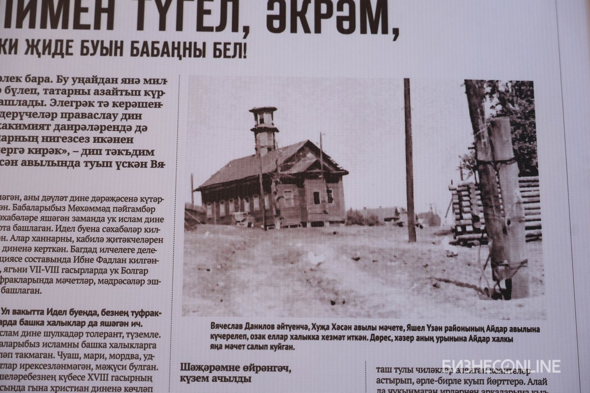Под портретами можно видеть выписки из архивов, в которых краеведу пришлось хорошенько покопаться. Все потому что, он помнил слова своего отца, Власа-ага, которые тот произносил на смертном одре: «Улым, помни о том, откуда мы произошли. Как нам завещали наши предки, мы — татары. Нас крестили насильно. Самым первым нашим дедом был Муса бабай, его, насильно крестив, назвали Моисеем». Отец аксакала рассказывал, что даже в его молодые годы старики резали скотину со словами «бисмилля Аллаху акбар» и таких примеров множество.