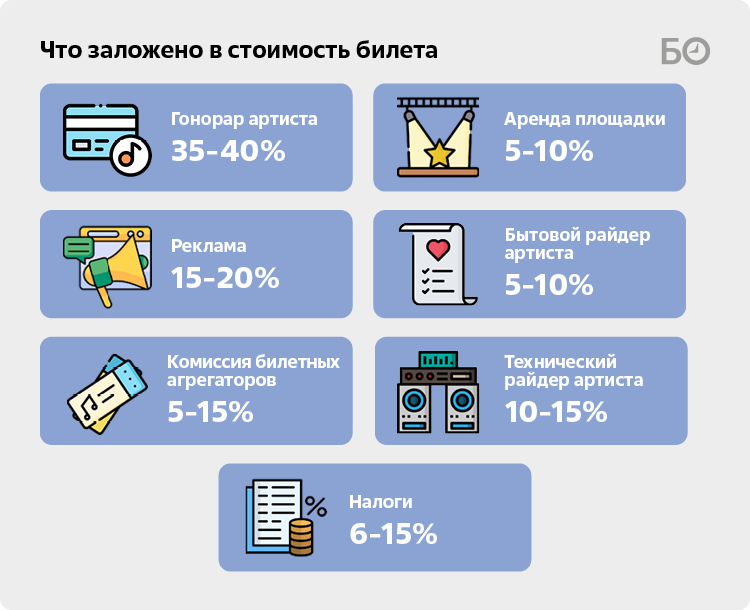 Разберем, сколько промоутеры закладывают в стоимость билета с каждого пункта расходов на один концерт.
