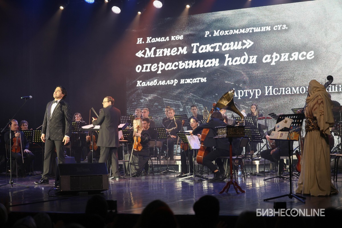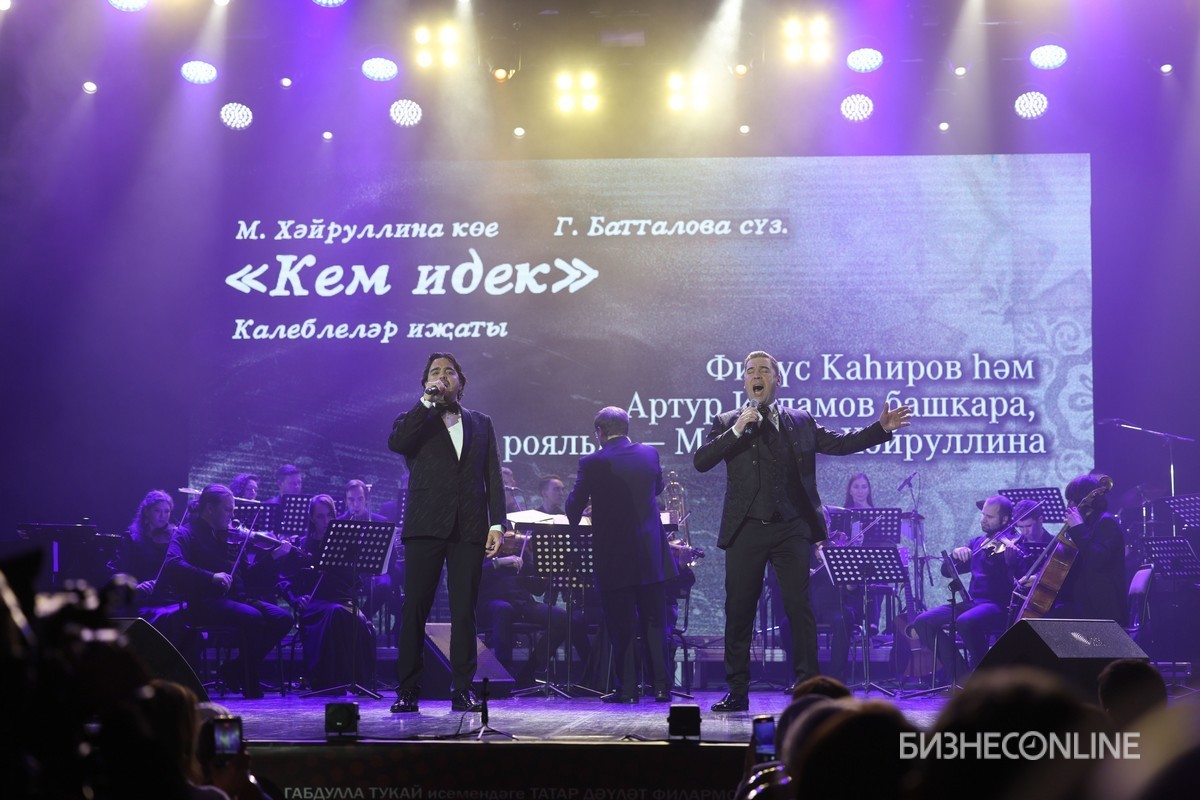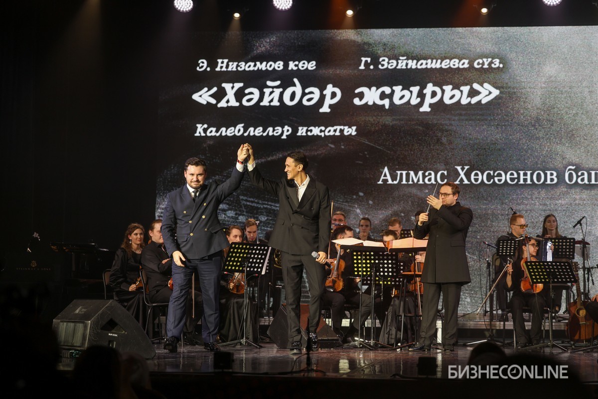 Первыми на сцену вышли Айдар Сулейманов, Ильгиз Мухутдинов и Динар Шарафетдинов, которые под аккомпанемент оркестра театра им. Тинчурина под управлением Ильяса Камала спели сайдашевскую «Без кабызган утлар».