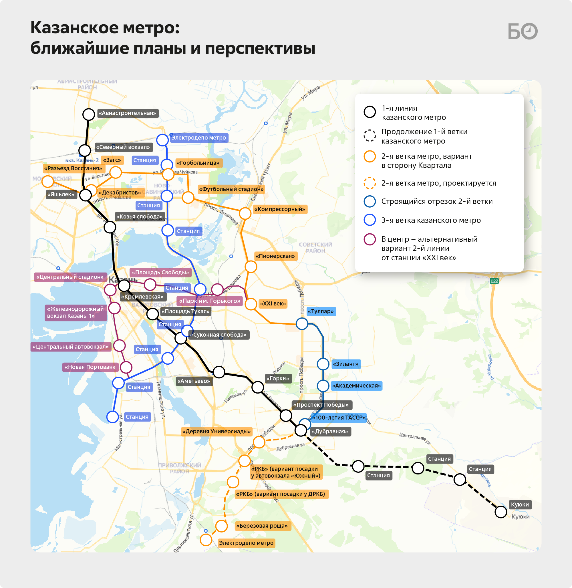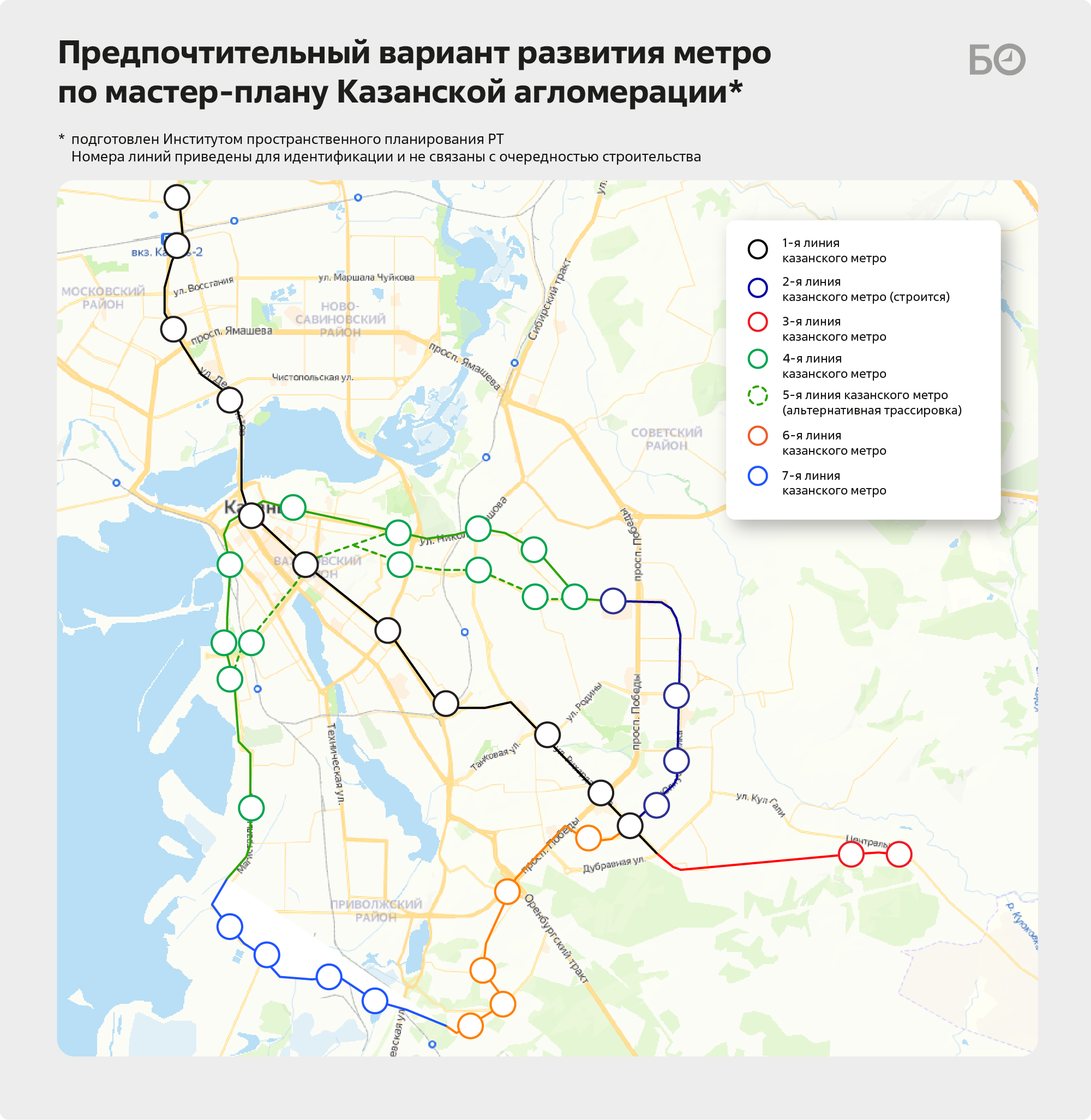 В 2020-м в Казани приняли, а в 2024-м скорректировали новый генеральный план города до 2040 года, который подготовил Институт генплана Москвы. В дополнение к существующей линии метрополитена с учетом ее продления до Куюков институт предложил строить две новые линии: