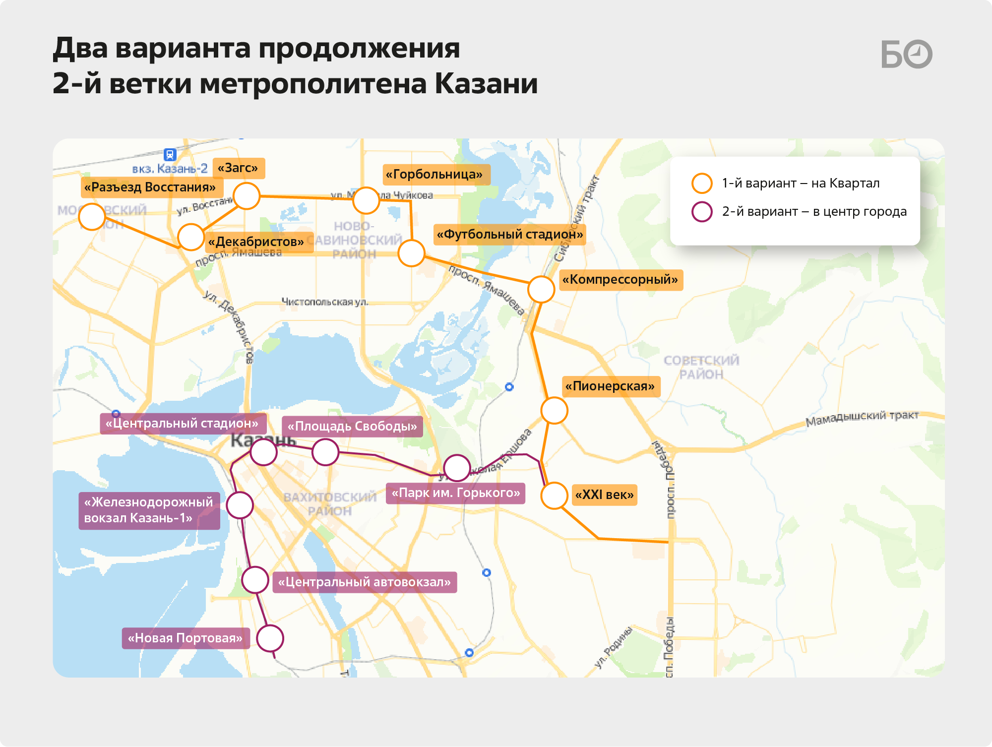 Дальнейшее развитие сети действительно может идти по двум вариантам пути: либо с продолжением строительства линии в северном направлении к существующим жилым массивам в Ново-Савиновский и Московский районы, либо с началом строительства центрального участка линии восток – центр города