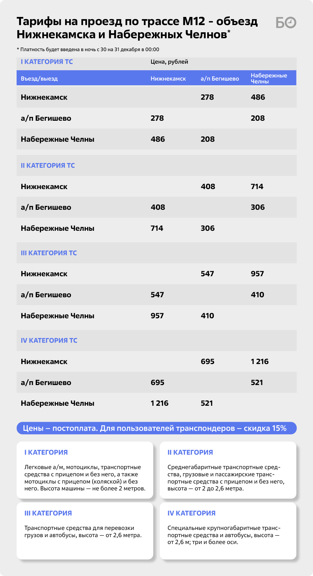 На отрезке 6 транспортных развязок, но цены на проезд «Автодор» обнародовал только для трех въездов и выездов рядом с Нижнекамском, аэропортом Бегишево и Набережными Челнами. Ниже приводим тарифы для легковых автомобилей на обозначенных отрезках М12 без скидки в 15% для владельцев транспондеров: