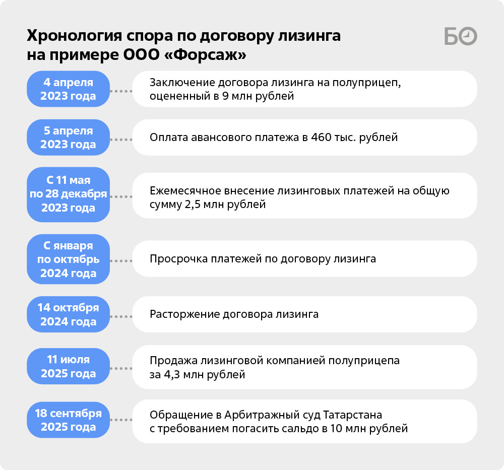 Отметим, что, согласно акту сверки взаимных расчетов, предъявленных в суд ЛК М7, лизинговая компания на протяжении 10 месяцев от начала просрочек не забирала у «Форсажа» прицеп и расторгла договор только в октябре 2024 года, указав в претензии задолженность лизингополучателя в 3,9 млн рублей (из которых 2,9 млн рублей — задолженность за 10 месяцев, 988 тыс. рублей — пени за просроченные платежи). Этот жест можно расценивать как лояльность компании к своим клиентам. Кстати, ЛК М7 Мустафин выбрал из-за самого низкого авансового платежа, предлагаемого лизинговыми организациями Татарстана.