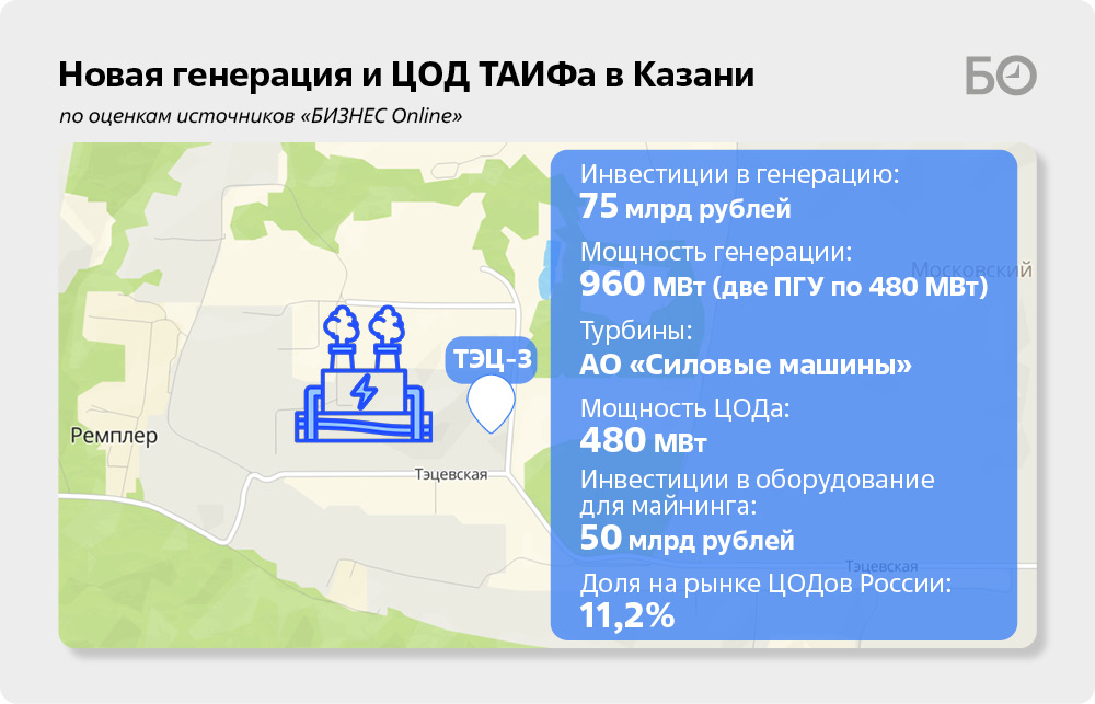Как стало известно «БИЗНЕС Online», группа «ТАИФ» Альберта Шигабутдинова вынашивает серьезные планы по развитию энергетических активов. Компания готова вложить 75 млрд рублей собственных средств в строительство двух парогазовых установок (ПГУ) по 480 МВт в Казани (общая мощность — 960 МВт, т. е. почти гигаватт). К слову, совокупная мощность всех трех казанских ТЭЦ сейчас — 1,6 гигаватта. Интересно, что ровно половина будущих мощностей (480 МВт) станет работать для монопотребителя — центра обработки данных (ЦОД), который в том числе будет нацелен на майнинг криптовалюты.