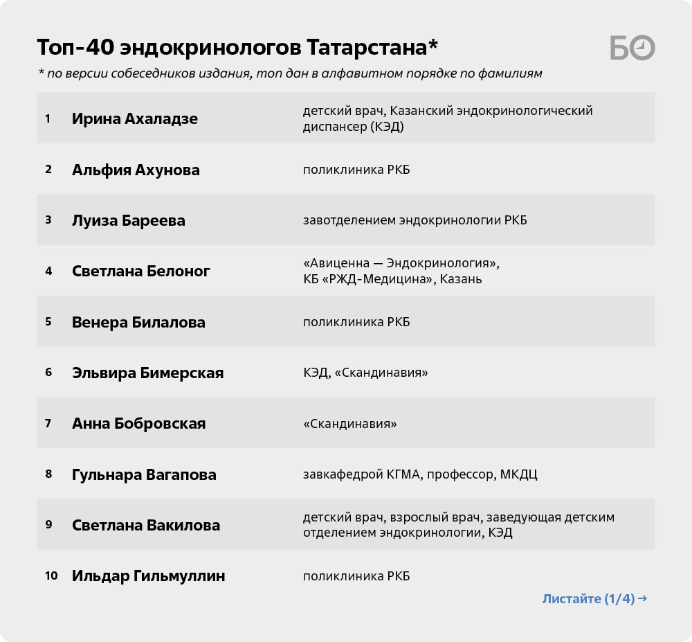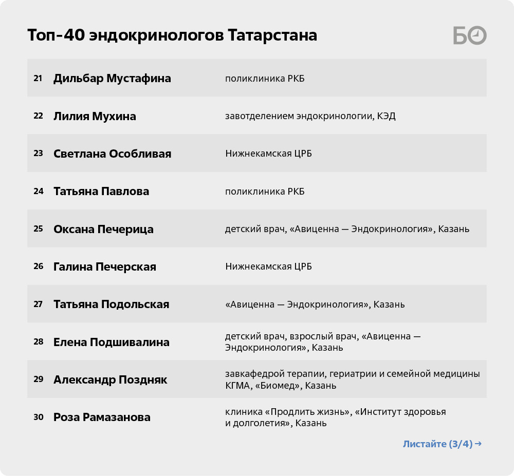 «По сахарному диабету много хороших специалистов и в Казанском эндокринологическом диспансере (КЭД): завотделением эндокринологии Лилия Мухина, врачи ее отделения Эльвира Бимерская, Радмила Михань. Подбор инсулинов и все прочее по части диабета — это к ним. А в поликлинике КФУ принимает Наталья Сорокина. К ней можно с любой патологией, там опыт и стаж бешеные», — говорят наши собеседники.