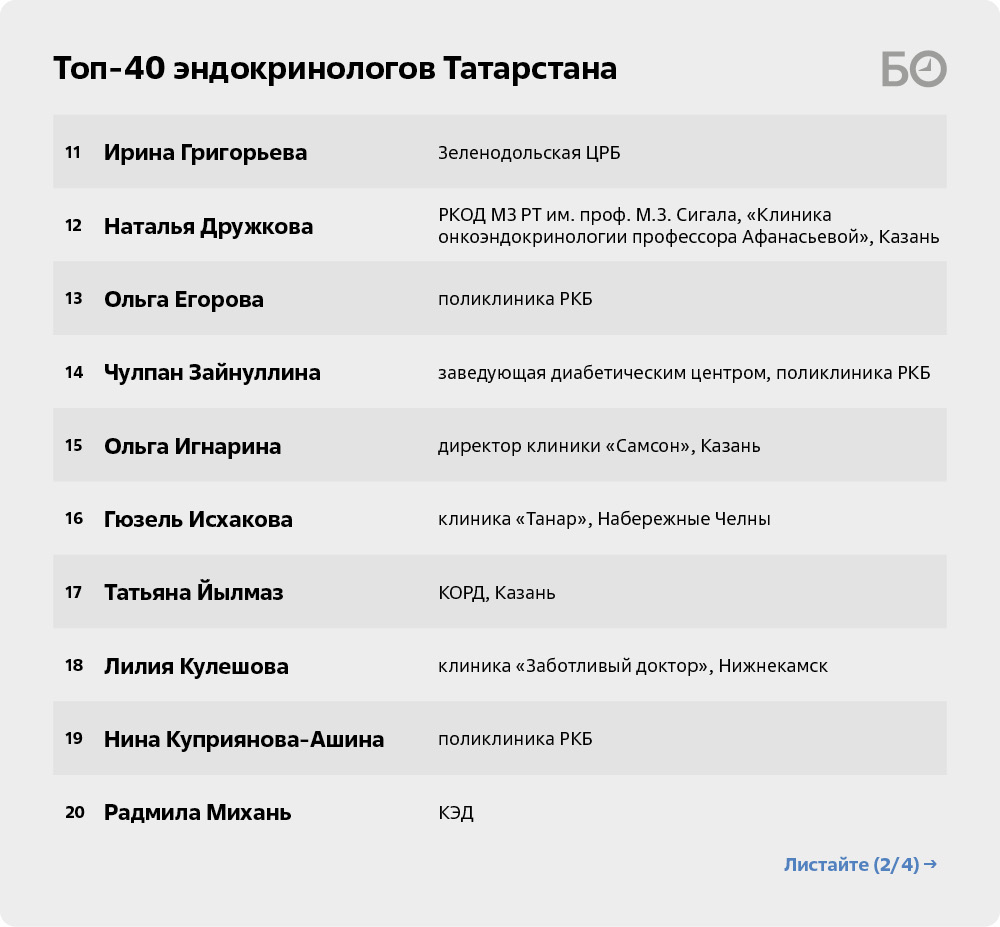 В Зеленодольске за внимательный подход в рамках ЦРБ хвалят Ольгу Рябкову и Ирину Григорьеву, а в Елабуге — Назиму Самигуллину.Мол, если они отправляют пациента в столицу, значит, на своем уровне сделали все. То же самое говорят и о Гюзель Исхаковой в Набережных Челнах. «Она долгое время возглавляла отделение эндокринологии городской больницы №2, сейчас больше в частных клиниках. Если из Челнов кого-то записывают, это значит, что Гюзель Саитовна сделала все что могла. Ее компетенций хватает, чтобы понять, нужно ли человека направлять в РКБ или сразу в федеральный центр», — говорят наши собеседники.