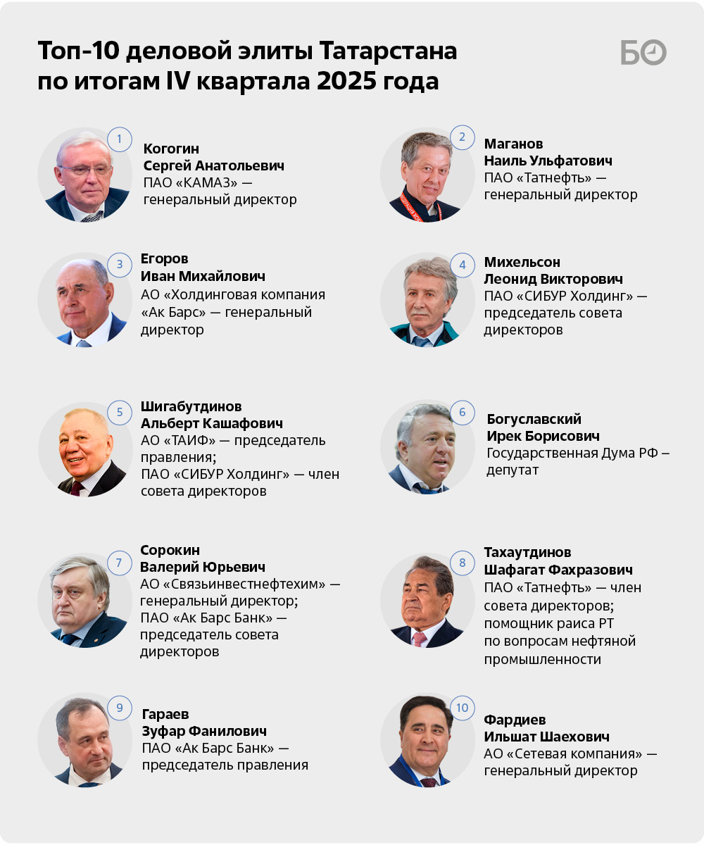По итогам IV квартала 2025 года в лидеры топ-100 деловой элиты РТ после нескольких падений вырывается гендиректор ПАО «КАМАЗ» Сергей Когогин. В декабре в Кремле он получил из рук президента РФ Владимира Путина звание Героя Труда России за особые трудовые заслуги перед государством и народом. Таким образом Когогину и заводу послан сигнал поддержки несмотря на то, что финансовые показатели автогиганта уже не первый квартал стремятся вниз. Так, чистый убыток КАМАЗа по РСБУ за январь – сентябрь 2025-го составил 29,1 млрд рублей, увеличившись в годовом выражении в 7,6 раза. При этом выручка снизилась на 11,2% и оказалась на уровне 203,1 млрд рублей.