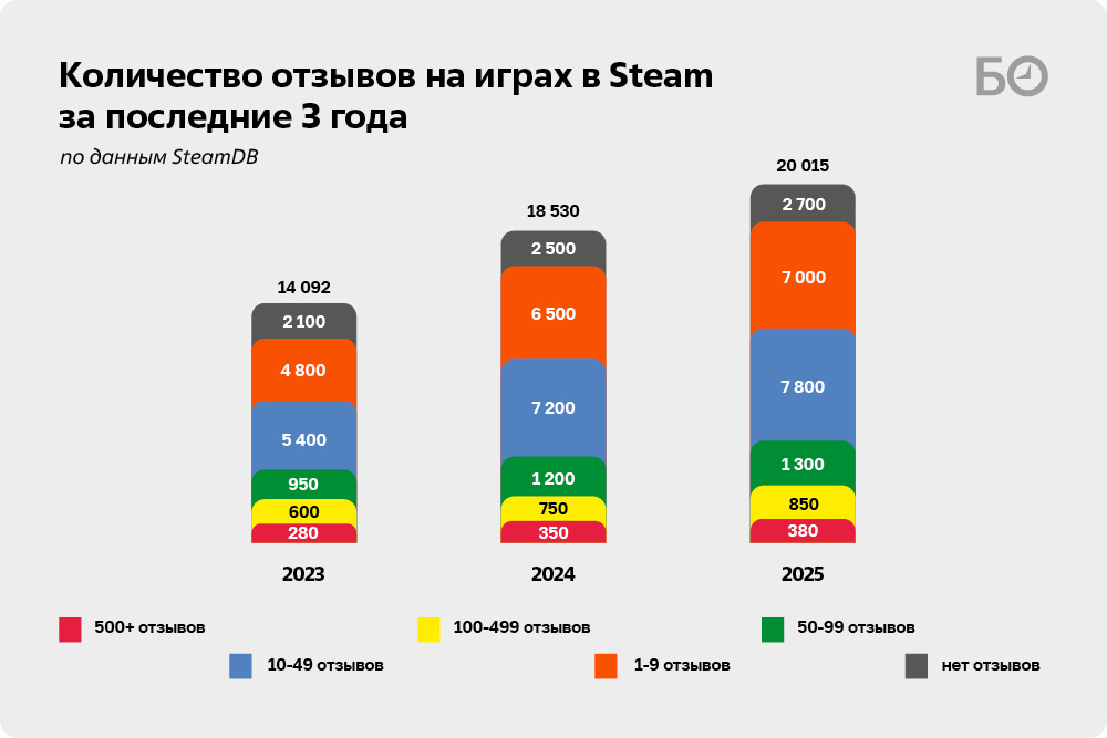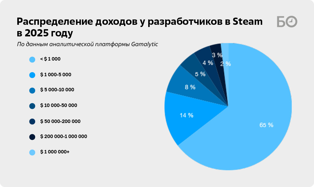 Заработать на играх в конечном итоге удается немногим. Почти половина (47,3%) всех игр, вышедших на Steam в 2025 году, либо не получили ни одного отзыва, либо получили от 1 до 9 отзывов. Это говорит о том, что значительная часть релизов остается практически незамеченной пользователями платформы. По данным аналитической платформы Gamalytic, которые изучил «БИЗНЕС Online», 64,7% игр, выпущенных в 2025 году, не заработали даже $1 тысячи. Что интересно, количество игр, которые достигли широкой вовлеченности игроков и коммерческого успеха, растет слабо — за последние три года этот показатель увеличился с 4 тыс. до 4,5 тыс., в то же время количество игр с 2023-го по 2025-й выросло с 12 тыс. до 20 тысяч.