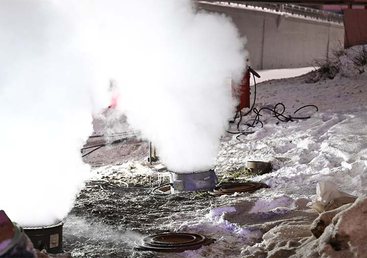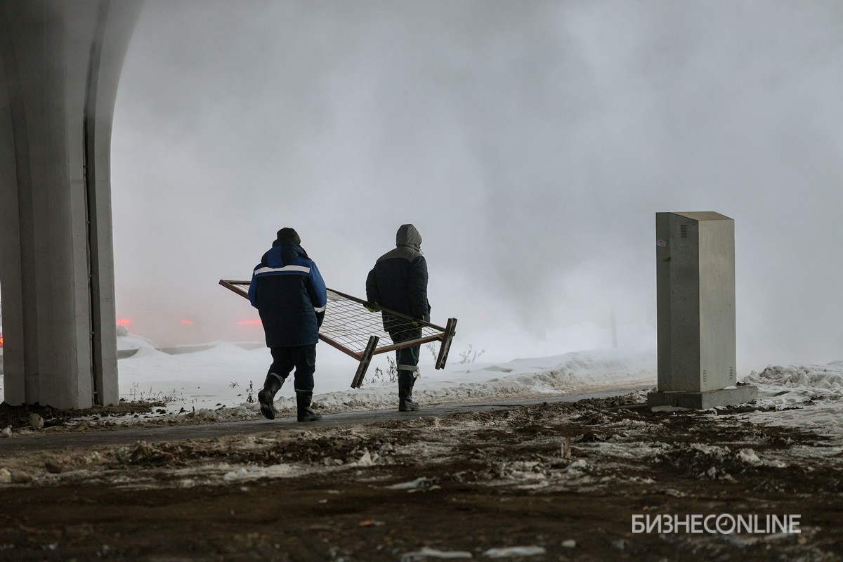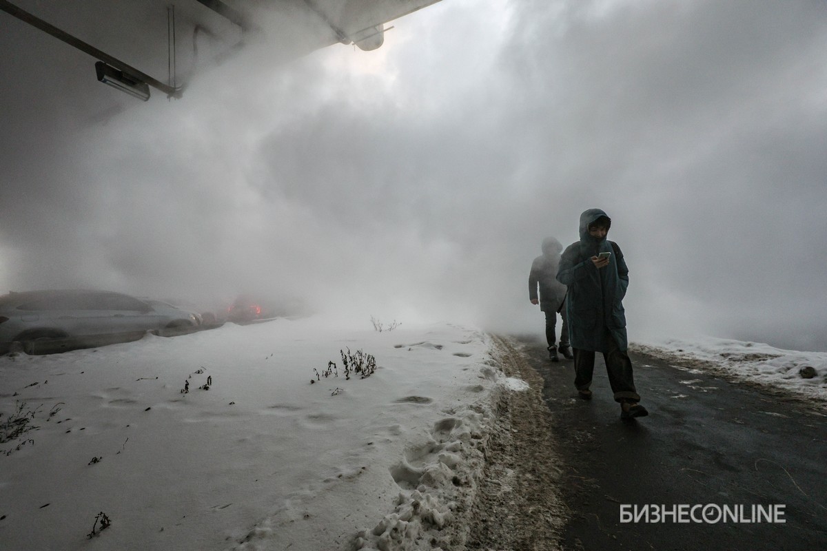 Пробравшись через «кордон» и окунувшись в густой туман с привкусом технической воды, в котором не видно ничего дальше собственного носа, мы оказались под мостом улицы Тихомирнова. Непосредственно на месте аварии, где уже работали сотрудники Казанских тепловых сетей.