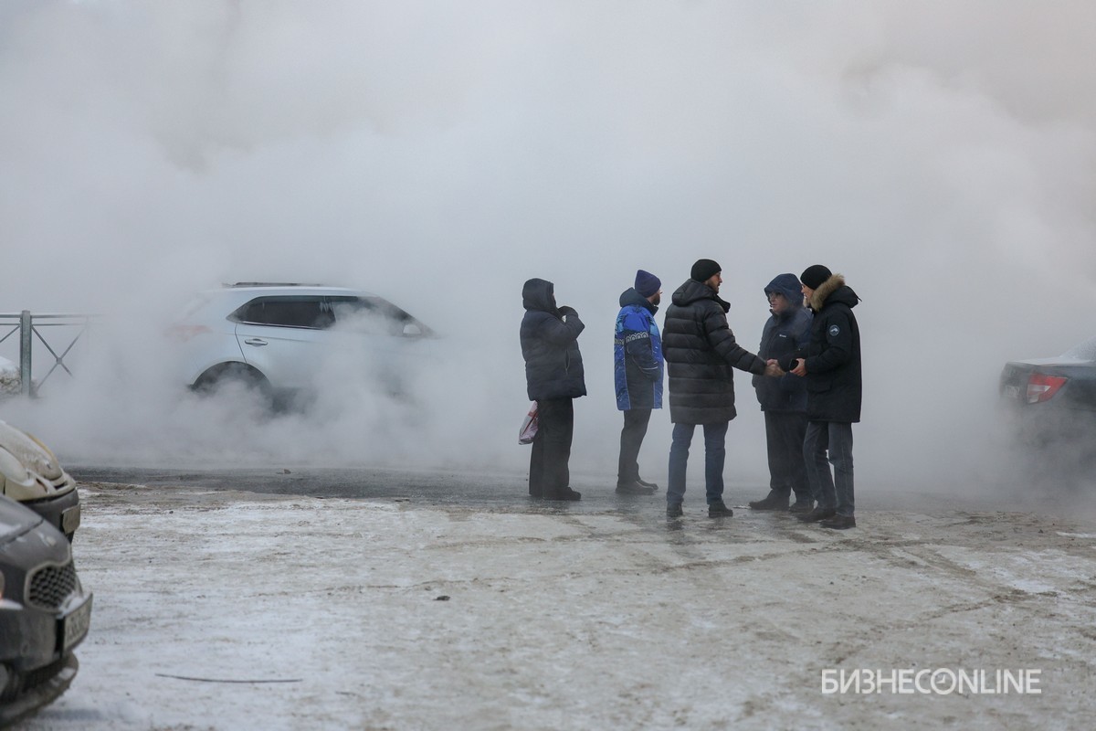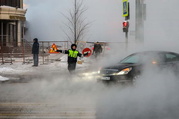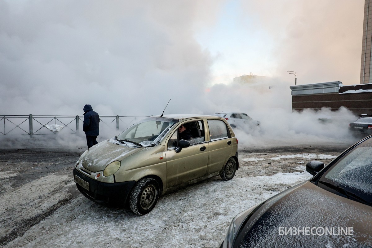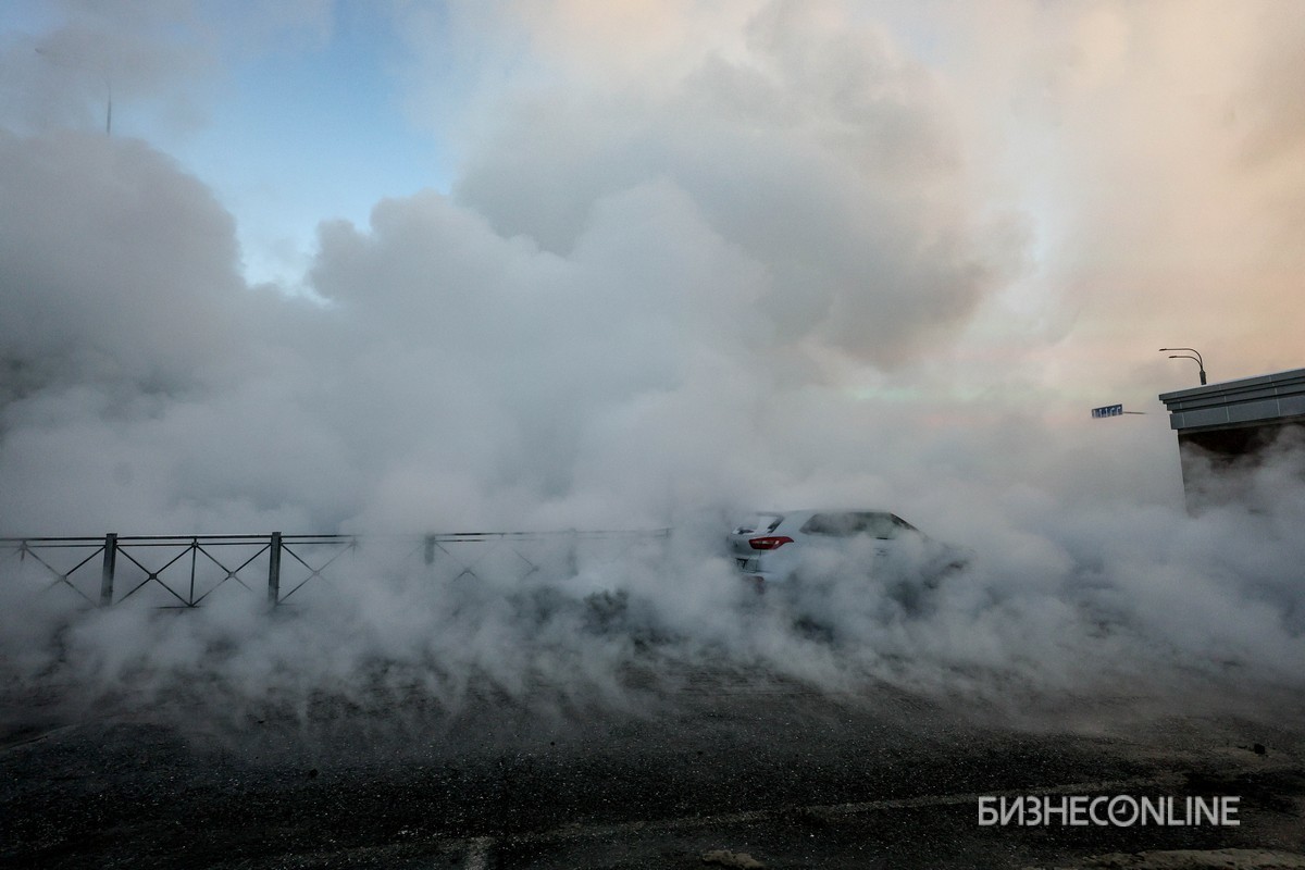 По соседству еще один источник пара — прямо около центрального здания «Метроэлектротранса». Улица покрылась кипятком, от которого валил пар, и люди вокруг спасали припаркованные автомобили. Один из очевидцев в беседе с нами рассказал, что мужчина, пытаясь найти свой автомобиль в неразберихе, умудрился ошпарить ноги и проковылял куда-то. Часть машин, которые не отогнали, стояла в тумане. Их владельцам не позавидуешь, ведь вся вода, испарившись, в итоге окажется в подкапотке, а потом ее прихватит 20-градусный мороз.