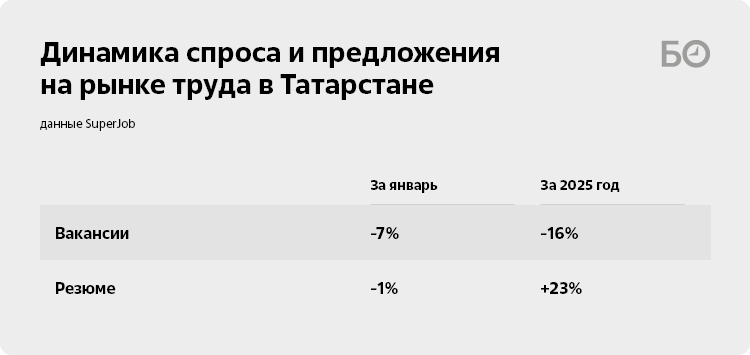 Работные сайты полностью подтверждают слова Муллина. Количество IT-вакансий в Татарстане сократилось на 49% по сравнению с 2024-м, сообщили в «Хабр Карьере» «БИЗНЕС Online». По России в целом падение составило 35%. Данные SuperJob более оптимистичные: на их платформе за год вакансий стало на 16% меньше, а резюме — на 23% больше. «Рынок труда становится более сбалансированным. У компаний снова есть выбор кандидатов, а соискателям нужно прикладывать больше усилий, чтобы выделиться среди конкурентов за вакантные места», — отметили в организации в ответ на запрос «БИЗНЕС Online».