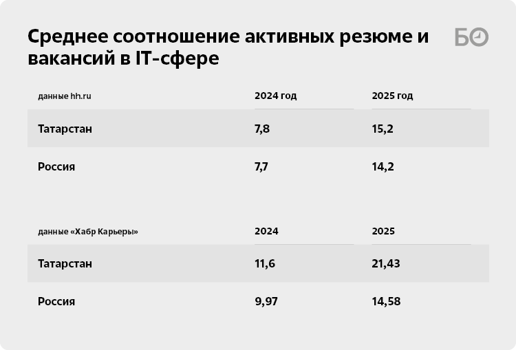Цифры hh.ru тоже фиксируют тренд снижения, хотя и не такого значительного: доля IT-вакансий от общего числа на рынке снизилась с 6 до 5% как в РТ, так и по России, сообщила газете директор «hh.ru Поволжье» Альбина Султанова. Соотношение активных резюме к одной вакансии за год увеличилось почти вдвое. В республике с 11,6 до 21,43 увеличилось количество резюме на вакансию, по данным «Хабр Карьеры», и с 7,8 до 15,2 резюме на вакансию, по сведениям hh.ru. Что происходит?