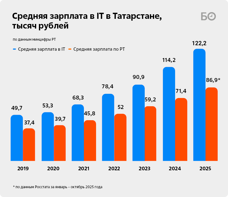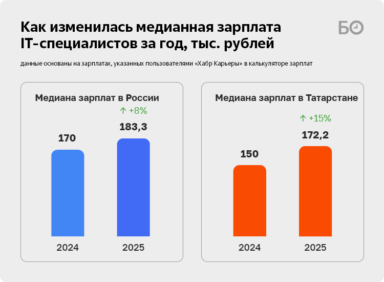Несмотря на падение числа вакансий и рост конкуренции, зарплаты IT-специалистов продолжают увеличиваться — причем в Татарстане темпы роста почти вдвое опережают общероссийские, говорят данные калькулятора зарплат на «Хабр Карьере», где специалисты сами указывают размер своей зарплаты. Медиана по России: выросла со 170 тыс. до 183,3 тыс. рублей (+8%), по Татарстану: с 150 тыс. до 172,2 тыс. рублей (+15%). В hh.ru же отмечают, что медиана предлагаемых зарплат в вакансиях в сфере ИТ в 2025 году в РТ составила 87,1 тыс. рублей, в целом по стране — 96,4 тыс. рублей (+9% к уровню 2024 в обоих случаях).