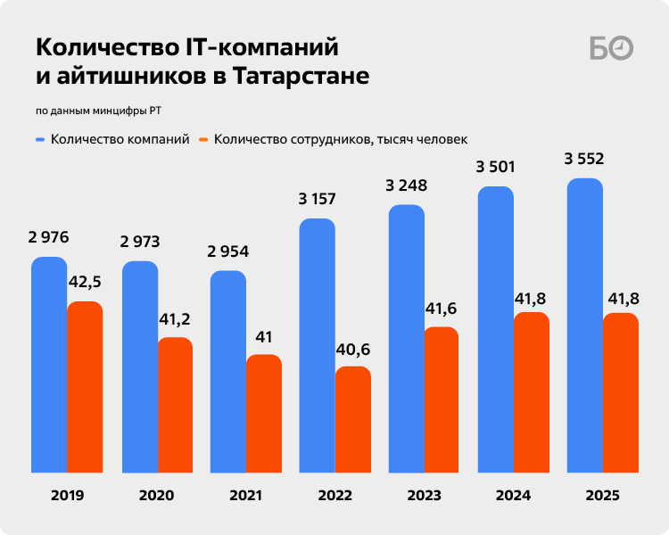 Власти в России при всем при этом продолжают говорить о дефиците кадров в IT. Российской экономике необходимо дополнительно минимум 600 тыс. IT-специалистов до 2030 года, говорил в апреле прошлого года вице-премьер РФ Дмитрий Григоренко. Дефицит айтишников в одном Татарстане еще в 2024 году экс-министр цифрового развития РТ Айрат Хайруллин оценивал в 10 тыс. человек — более свежих оценок ведомство пока не предоставило. Сегодня в республике работают 3,5 тыс. IT-компаний, где трудятся 41,8 тыс. ИТ-специалистов — это 3,3% работающего населения республики.В прошлом году IT-специальность в Татарстане получили почти 3,7 тыс. человек.